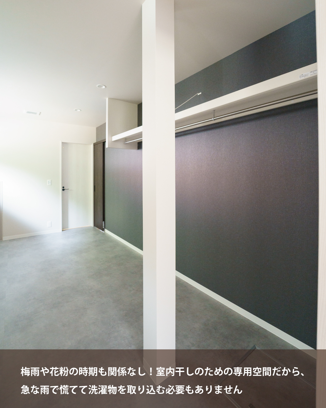 梅雨や花粉の時期も関係なし!室内干しのための専用空間だから、急な雨で慌てて洗濯物を取り込む必要もありません。乾燥機と組み合わせれば、さらに時短になります。