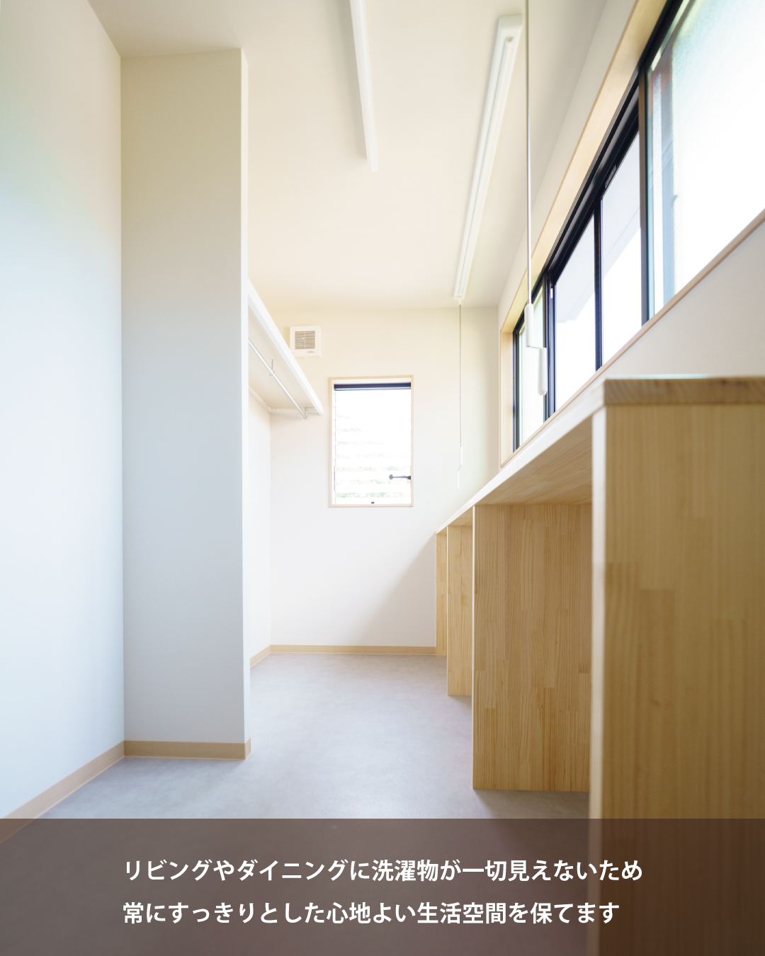 リビングやダイニングに洗濯物が一切見えないため、急な来客も安心。常にすっきりとした、心地よい生活空間を保てます。
