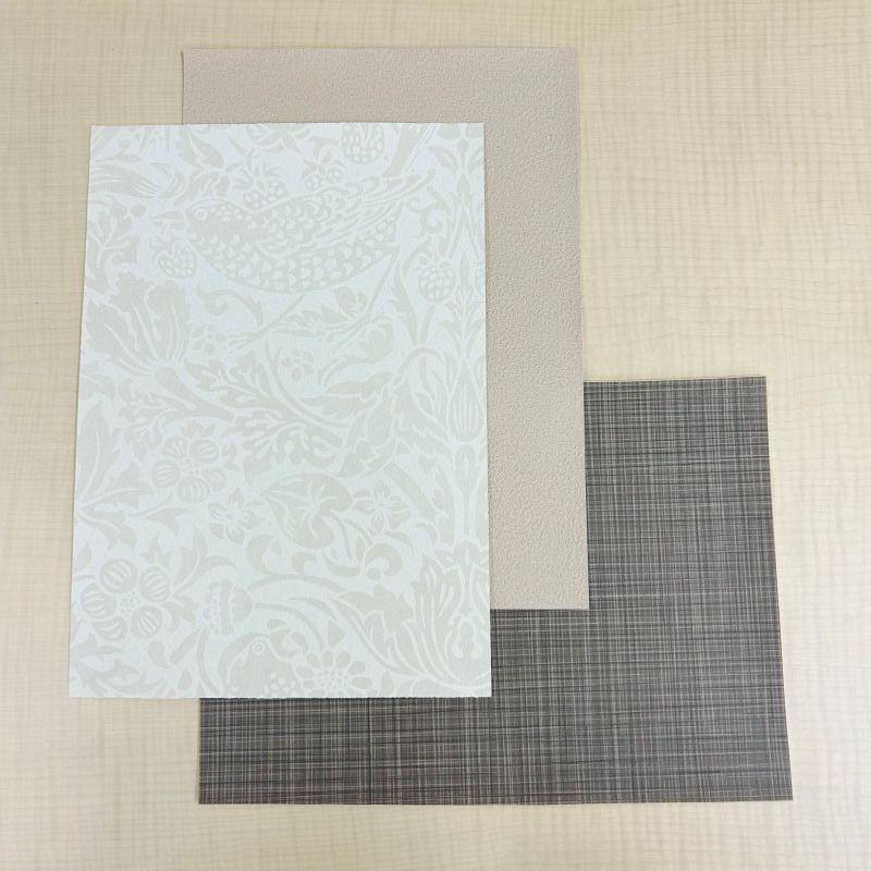 クロスのカタログをお渡しし、気になるクロスの品番を挙げてもらい、打ち合わせではA4サイズのクロスサンプルを使用して決めていきます。