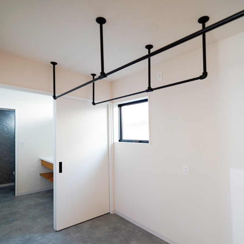 そこにスタイリッシュな天井吊り下げタイプのアイアンバーを取り入れるとより便利に。