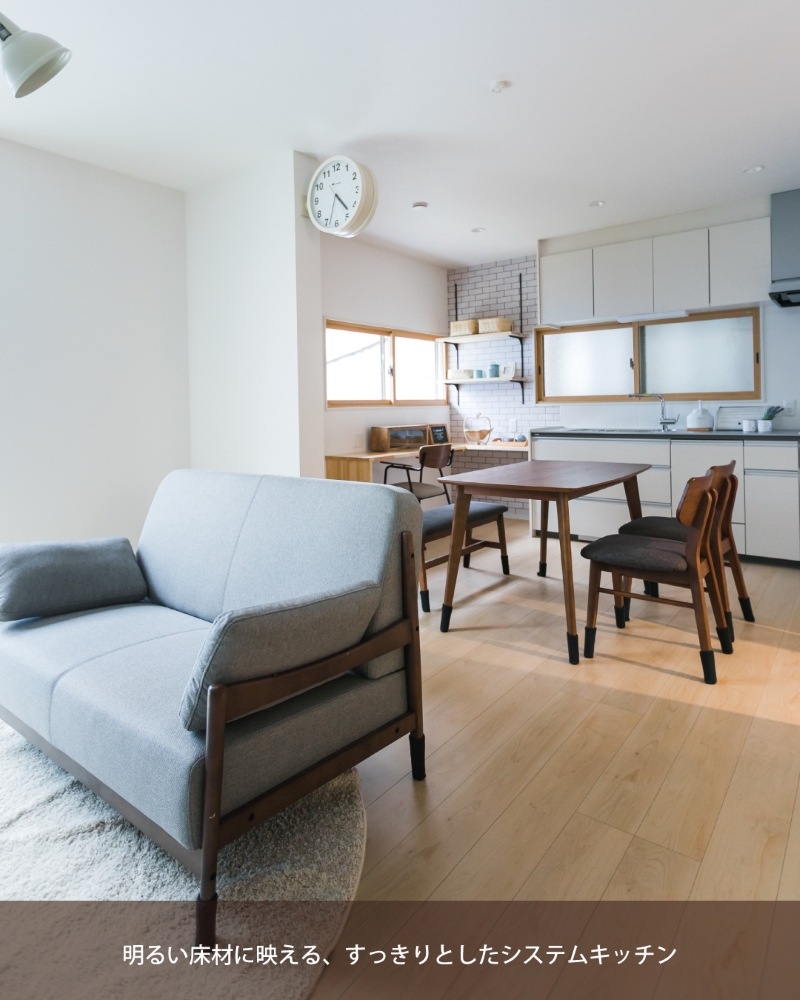 LDK:明るい床材に映える、すっきりとしたシステムキッチン。ダイニング奥の白いブリックタイル風の壁が、空間にリズムと奥行きを与えています。