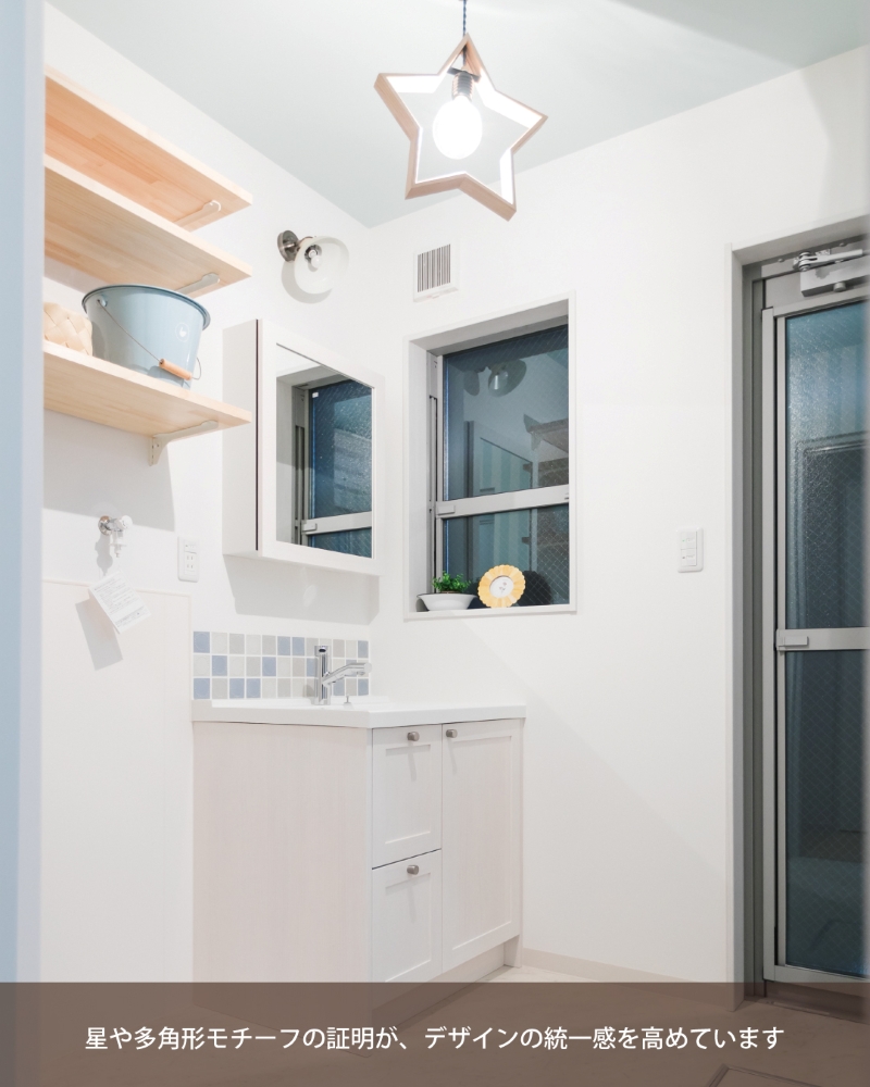 洗面室:照明に用いられた星や多角形のモチーフが、家全体の「遊び心」や「モダンさ」といったデザインテーマを統一する役割を果たしています。