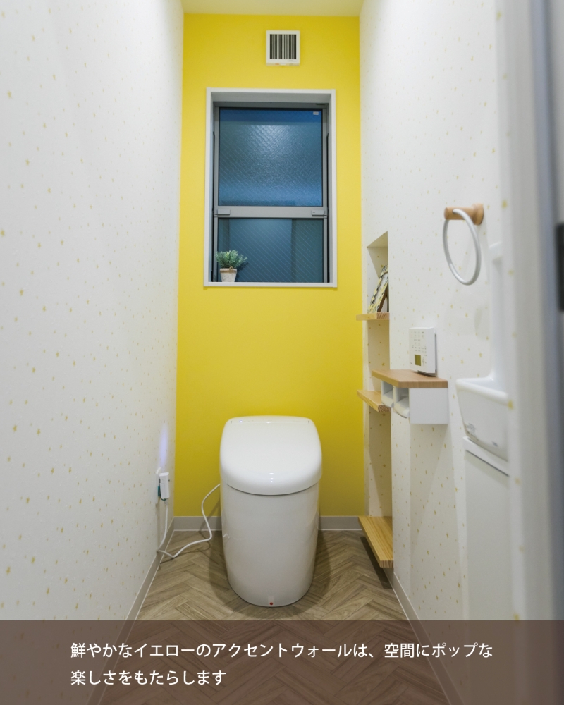 トイレ:トイレの鮮やかなイエローのアクセントウォールは、空間にポップな楽しさをもたらします。