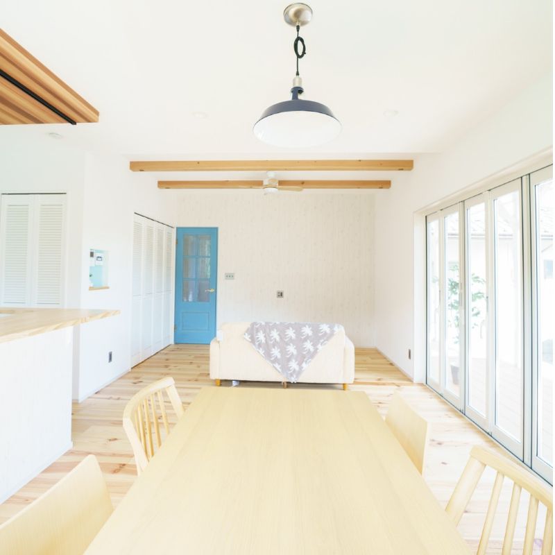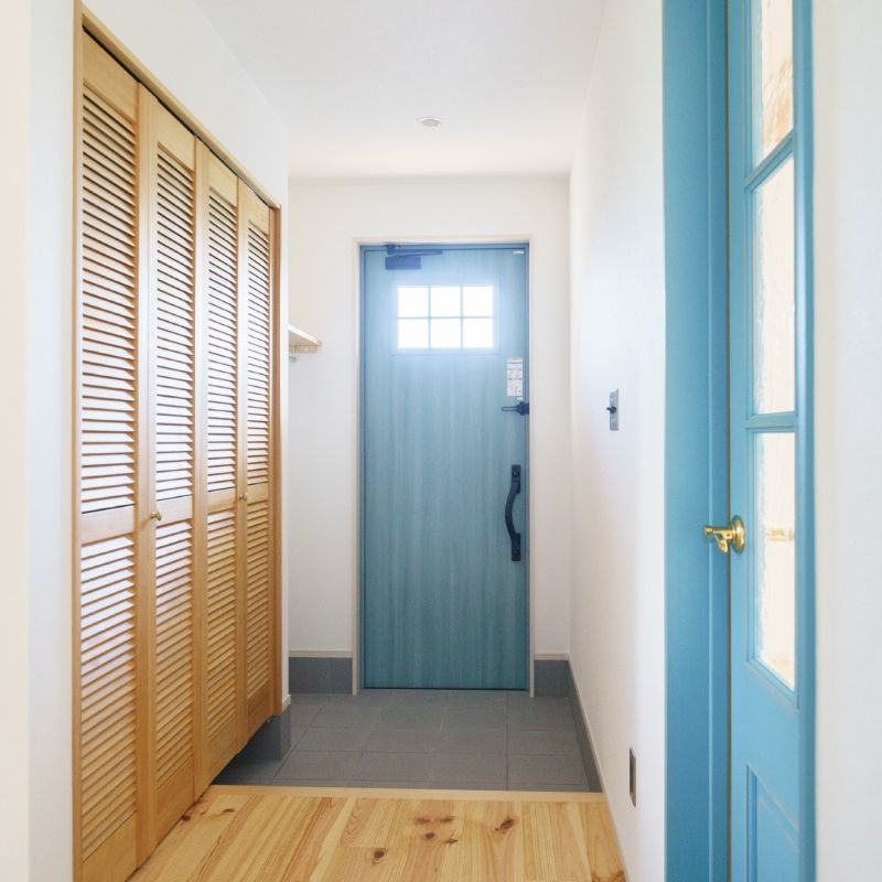 ターコイズブルーのアクセントドアが、白と木の空間にパッと映えて、一気に西海岸のムードを高めてくれます!