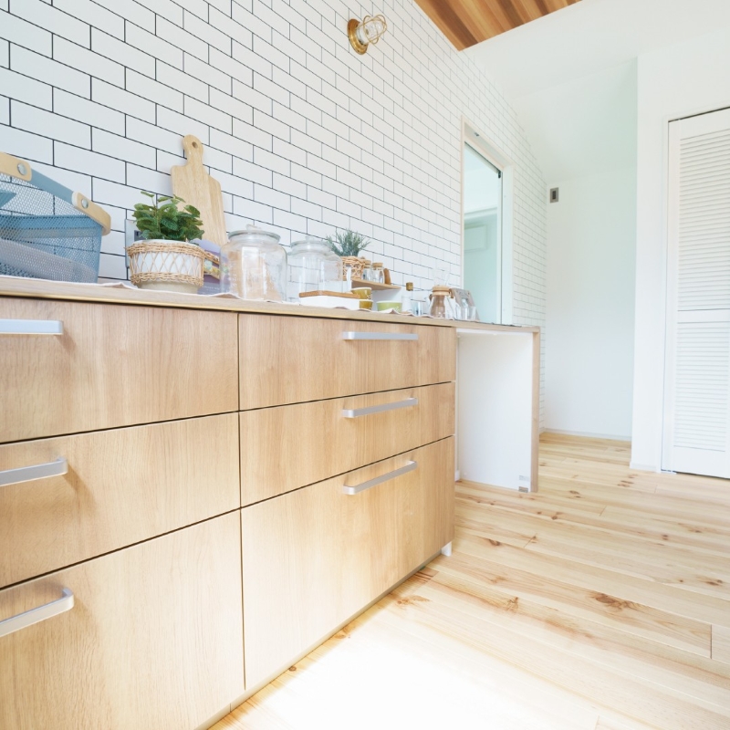 キッチン前の壁にはサブウェイタイル風の白のクロスを採用し、ヴィンテージ感のあるゴールドの照明をプラス。さりげなく海辺のカフェのようなこなれ感を演出しています。