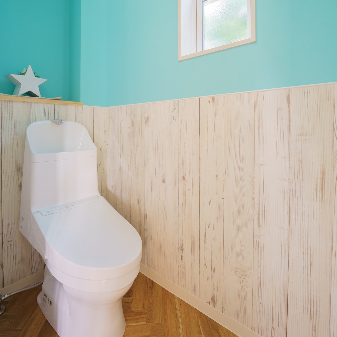 そして、遊び心を加えたのがトイレ!🚻 ミントブルーの壁とヘリンボーン柄の床、シャビーな板壁風クロスで、どこを切り取っても「可愛い」が溢れる空間に😊