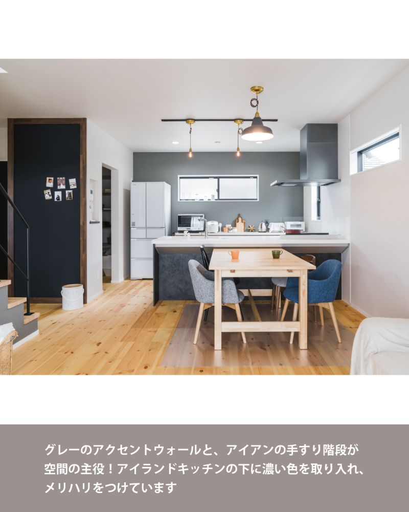 ポイントは、リビングから続くアイアンの手すりの階段と、空間を引き締めるマットなグレーのアクセントウォールです。無骨なインダストリアルデザインの要素をプラスすることで、温もりがありながらも洗練された、飽きのこない空間に!