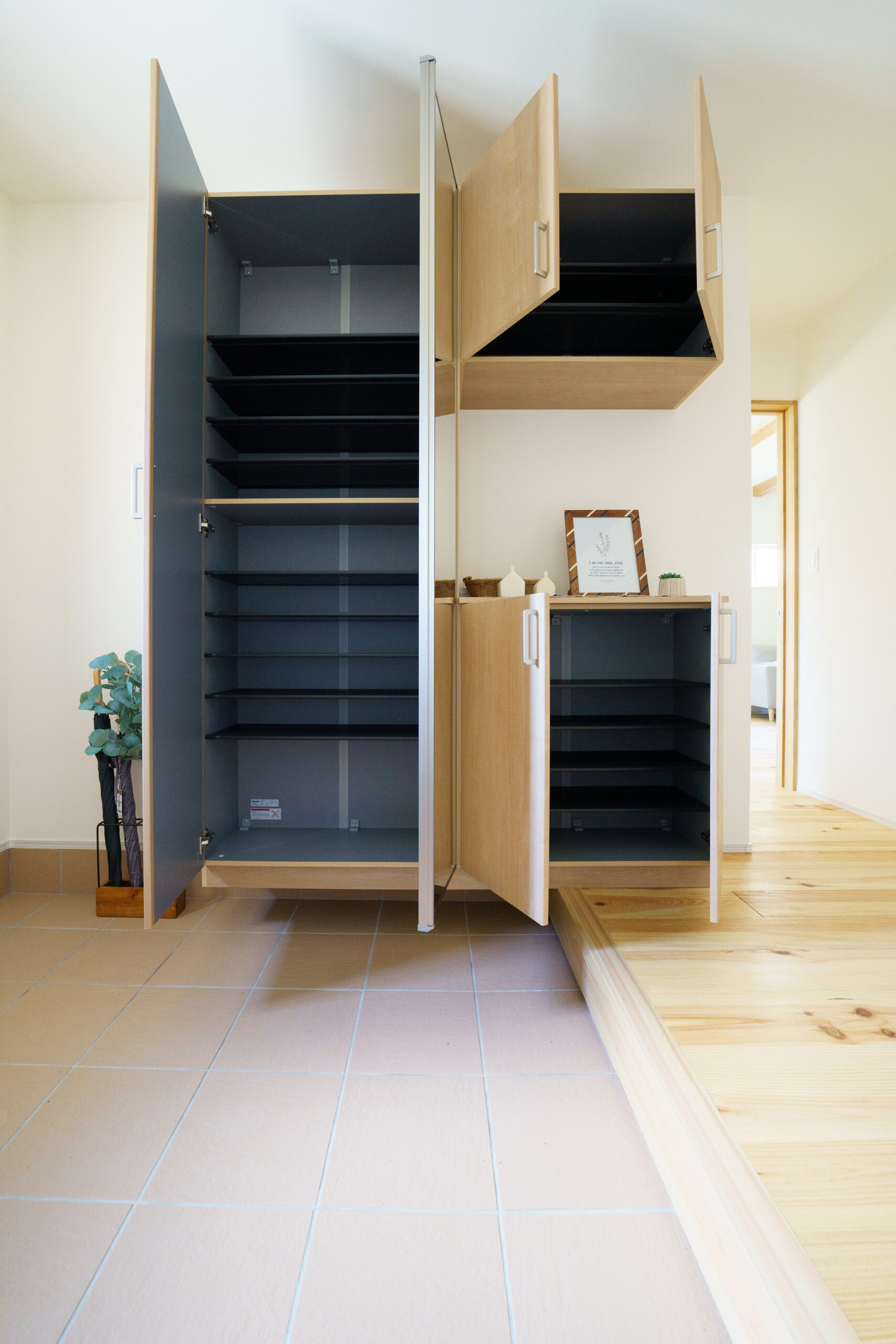 玄関収納は、棚の高さを調節できる可動棚がおすすめです。高さのあるモノでも収納出来ます。