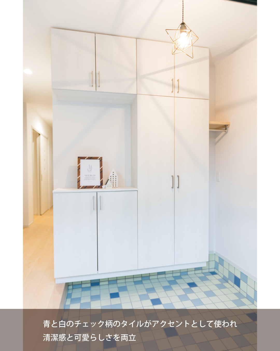 玄関:玄関の土間スペースには、青と白のチェック柄のタイルがアクセントとして使われ、清潔感と可愛らしさを両立しています。