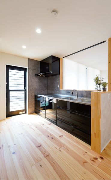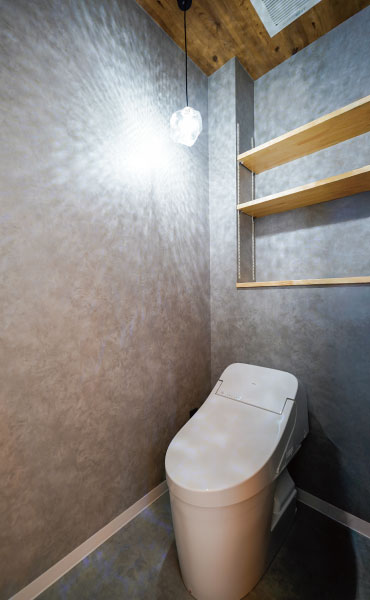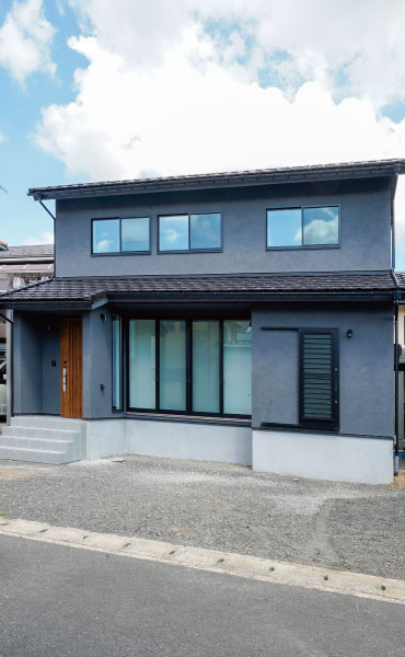 シックなダークグレーの塗り壁仕上げで落ち着いた印象の外観