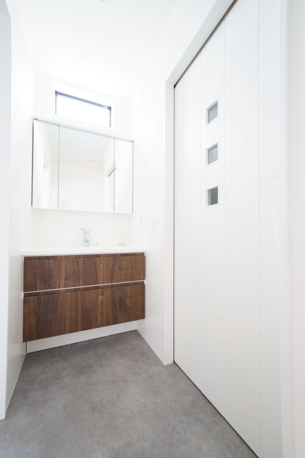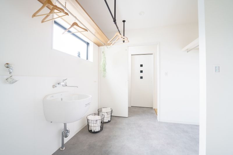 開放感抜群で2階とも繋がりやすいです。広い脱衣室はランドリールームとしても使えます。スロップシンクも付いていて家事ラクです。
