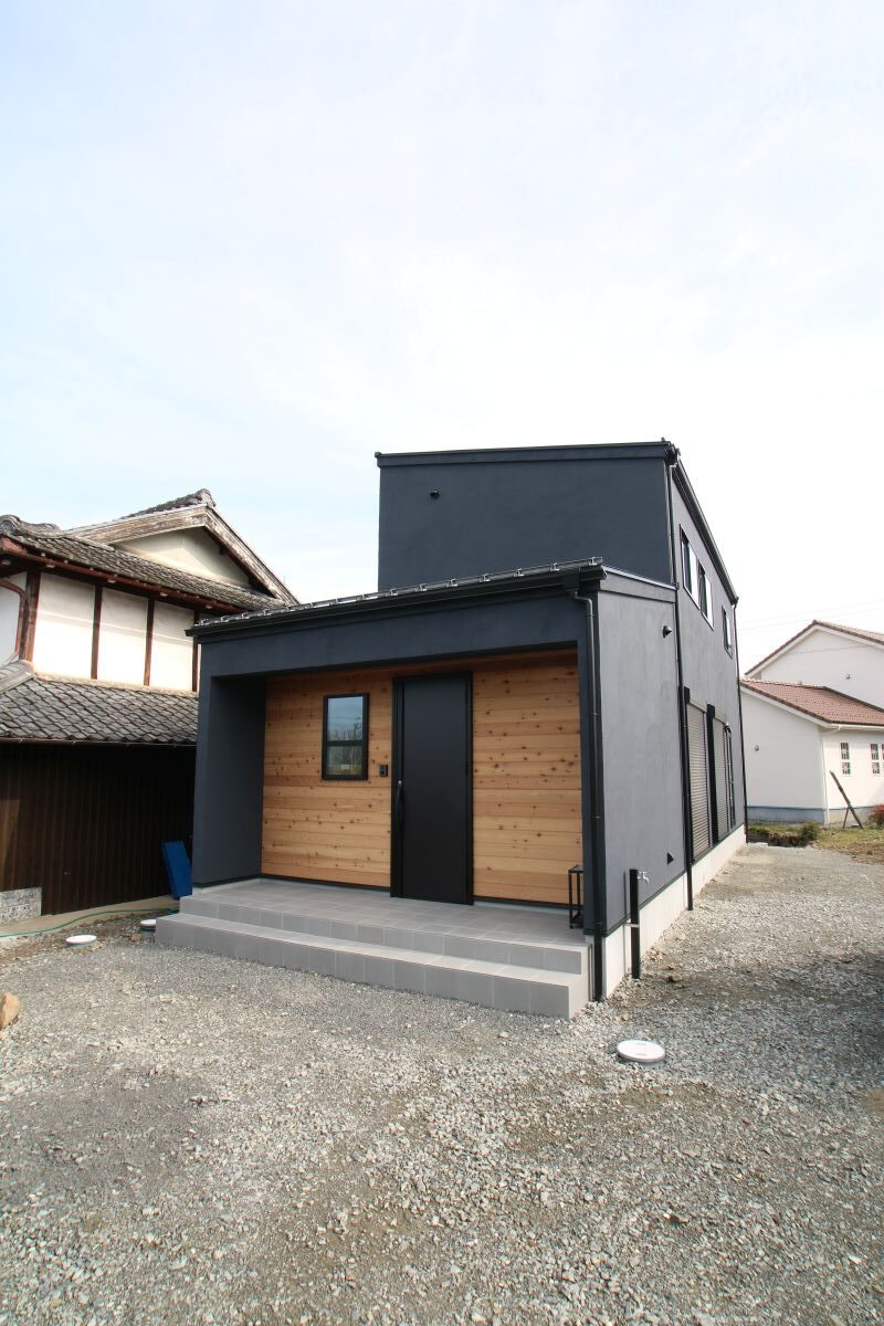 ネイビーの塗り壁に板張りのカッコイイ外観