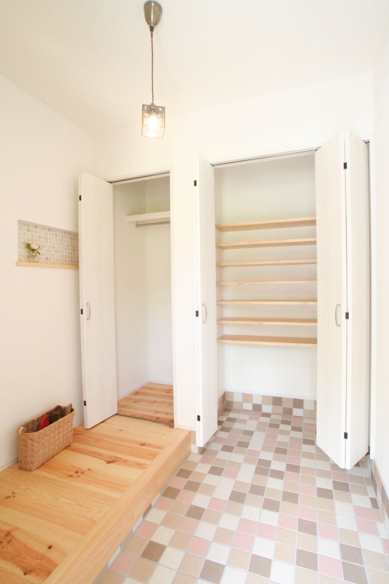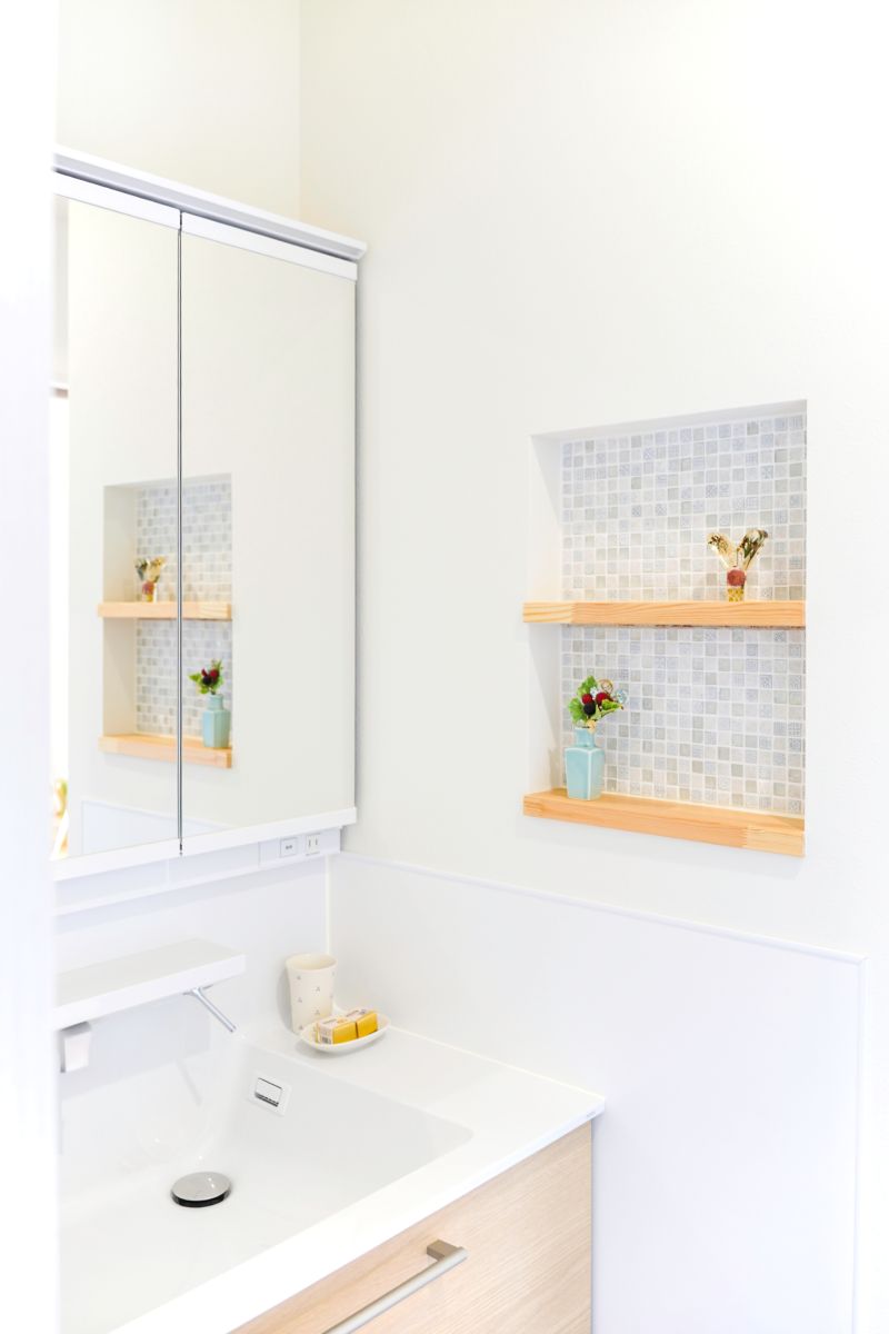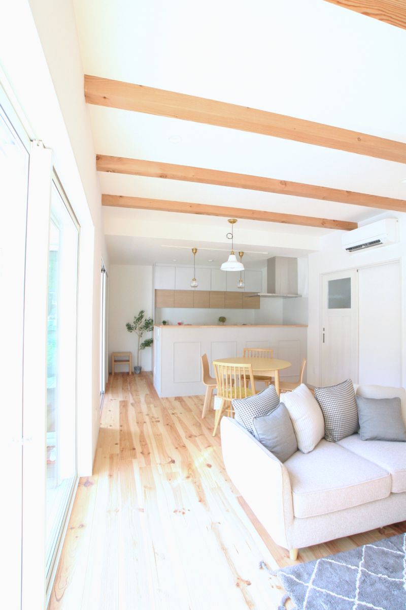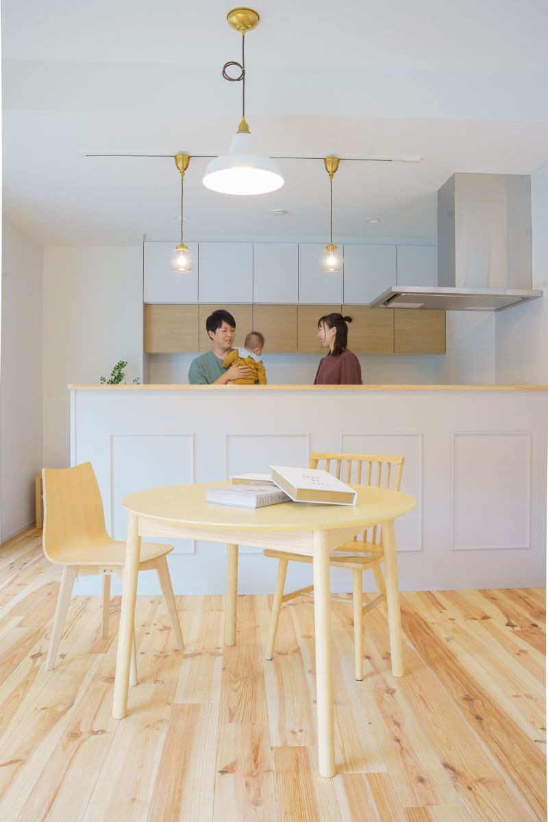 舞鶴市 H様邸 大好きを詰め込んだフレンチカントリーのお家LDKは、自然素材のフローリングです梁見せリビングで広々空間ダイアトーマスの塗り壁で見た目も機能もバッチリキッチン本体と背面のカップボードを白で統一することで、視覚的な圧迫感を抑えてくれます土間収納は、奥行きもしっかりあるのでベビーカーなども収納できます1階に和室があることで、老後寝室や客間としても使えます全面南向きで明るいお部屋です異なる方向に配された複数の窓から、たっぷりの自然光が差し込みます脱衣室には、アイロンをかけたり洗濯物を畳んだり使い勝手の良い造作カウンターがあります洗面台の横に、歯ブラシやお気に入りの小物を飾れるニッチを配置クロスの切り替え部分に設けた木目の棚板は、ストックを置くだけでなく、お気に入りの雑貨を飾るディスプレイコーナーとしても活躍します設計のポイントキッチンに立つと、ダイニング・リビング・和室、さらにはウッドデッキまで視線が届きます。お子様がどこで遊んでいても安心です。