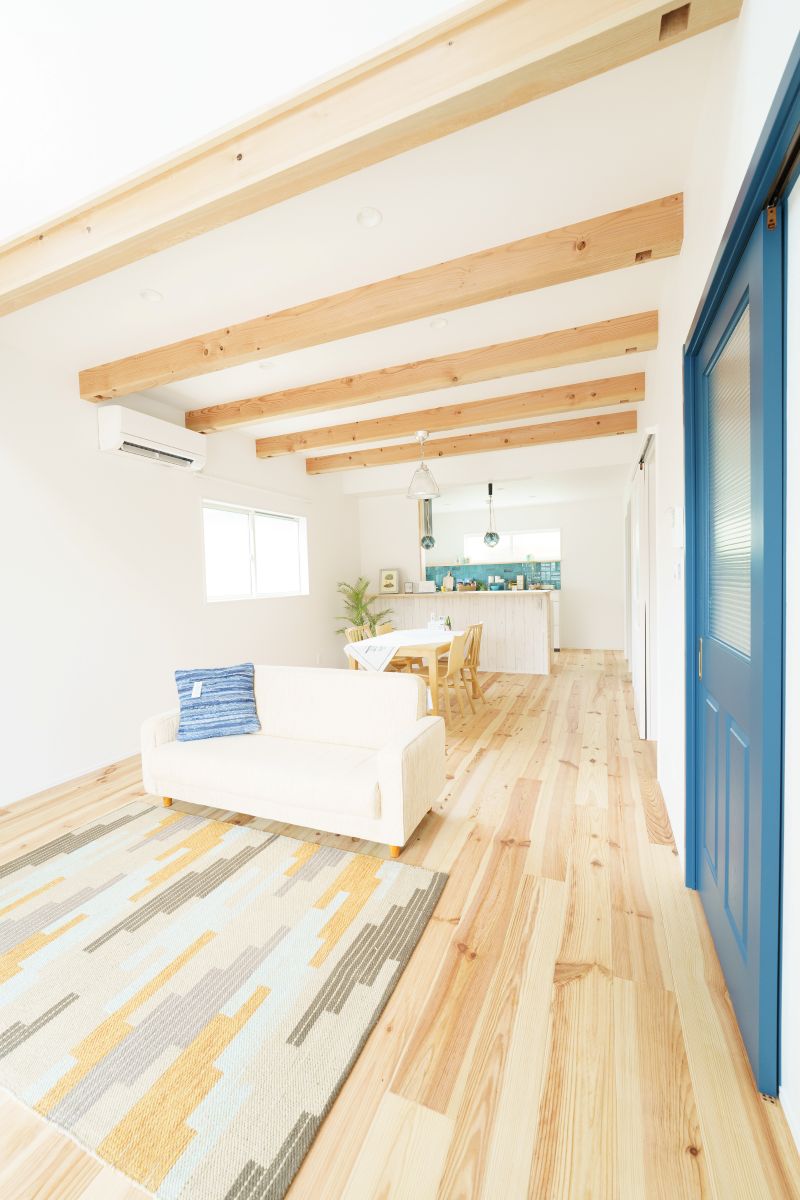 15帖のLDKの上部が大きな吹き抜けになっています。非常に開放感があり、2階とも繋がりやすい設計です。