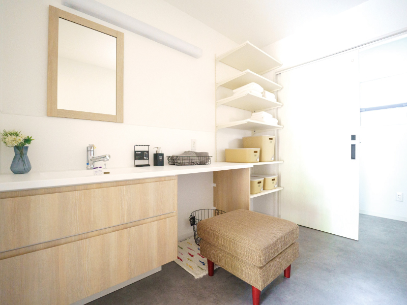 造作洗面台は二人並んでもゆったりと使えるサイズを選びました。可動棚には家族それぞれの小物からタオル、掃除道具までスッキリ収納していただけます。
