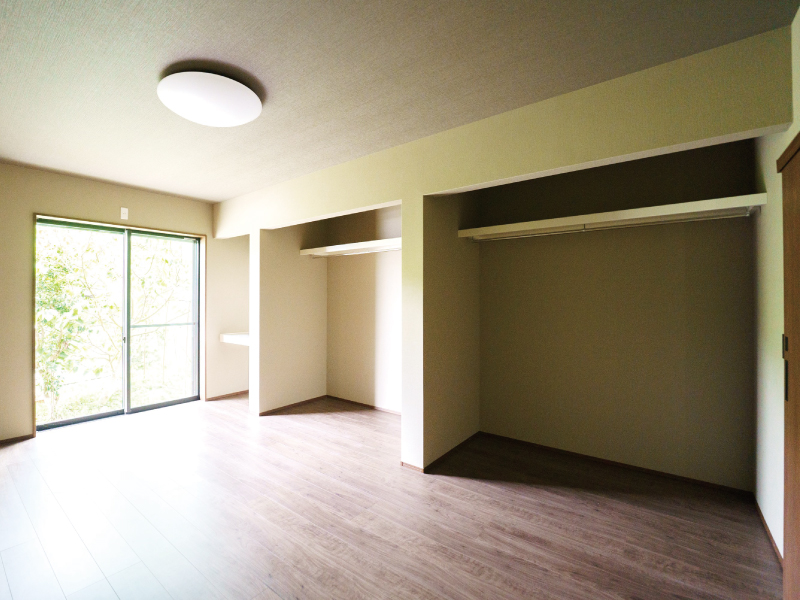 オープンクローゼットで広々とした空間にブラウンの落ち着いた雰囲気。