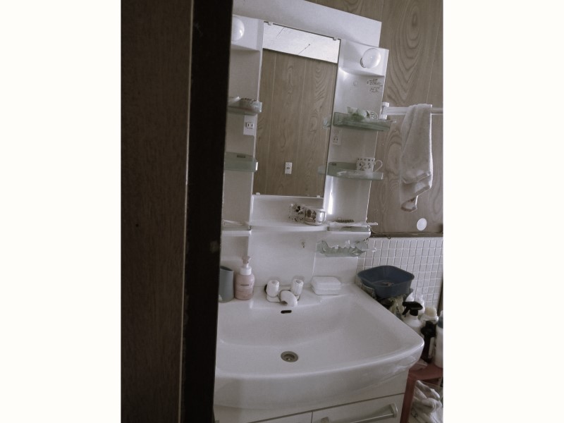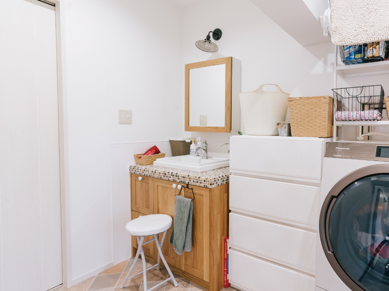 木製の洗面台や鏡のフレームが温かみを感じさせ