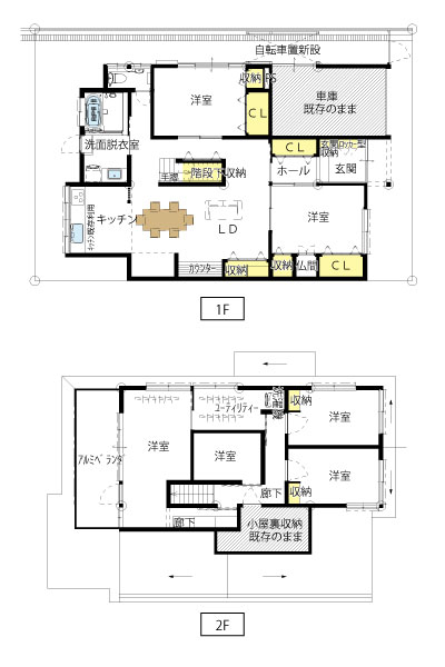 【舞鶴市】 二世帯が暮らす、断熱・バリアフリーが叶った快適リフォームリフォームの概要施工期間5ケ月形態戸建てフル面積43坪築年数46年Before複数人で調理・配膳するときに動きづらい。収納スペースが少なかった。一部に老朽化が見られた。図面Before1.2階間取り改修前After1.2階間取り改修後リフォームのポイント同居をきっかけに全面バリアフリー・断熱改修・浴室の快適化に加え、2階に洗濯スペースを新設し、二世帯が安心して暮らせる住まいを実現しました。二級建築士 竹下戸建てフルリノベ【舞鶴市】猫と暮らす快適リノベーションハウスNew!!2026年3月14日戸建てフルリノベ【舞鶴市】築50年 フルリノベーションNew!!2026年3月14日戸建てフルリノベ【舞鶴市】二世帯が暮らす、断熱・バリアフリーが叶った快適リフォーム2025年7月19日中古リノベ【舞鶴市】 家事効率を最大化!回遊動線で快適に暮らすリノベーション2025年6月6日中古リノベ【舞鶴市】 ご夫婦が快適に暮らす減築リノベ2025年6月5日平屋リノベ【舞鶴市】 猫も喜ぶサーフスタイルの家2025年6月5日